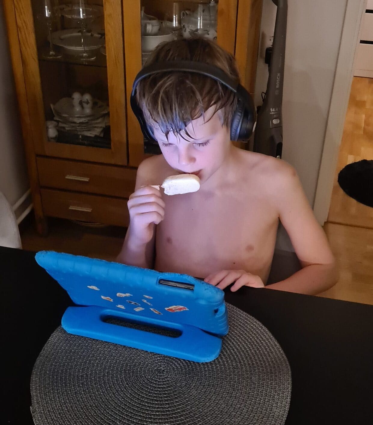 Men inte Albin, han har inte rört sig ur fläcken sen dom kom hem förutom när det var middag.