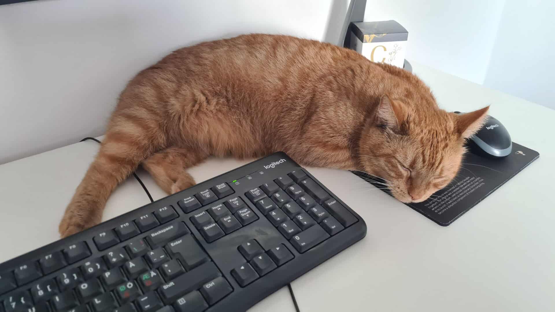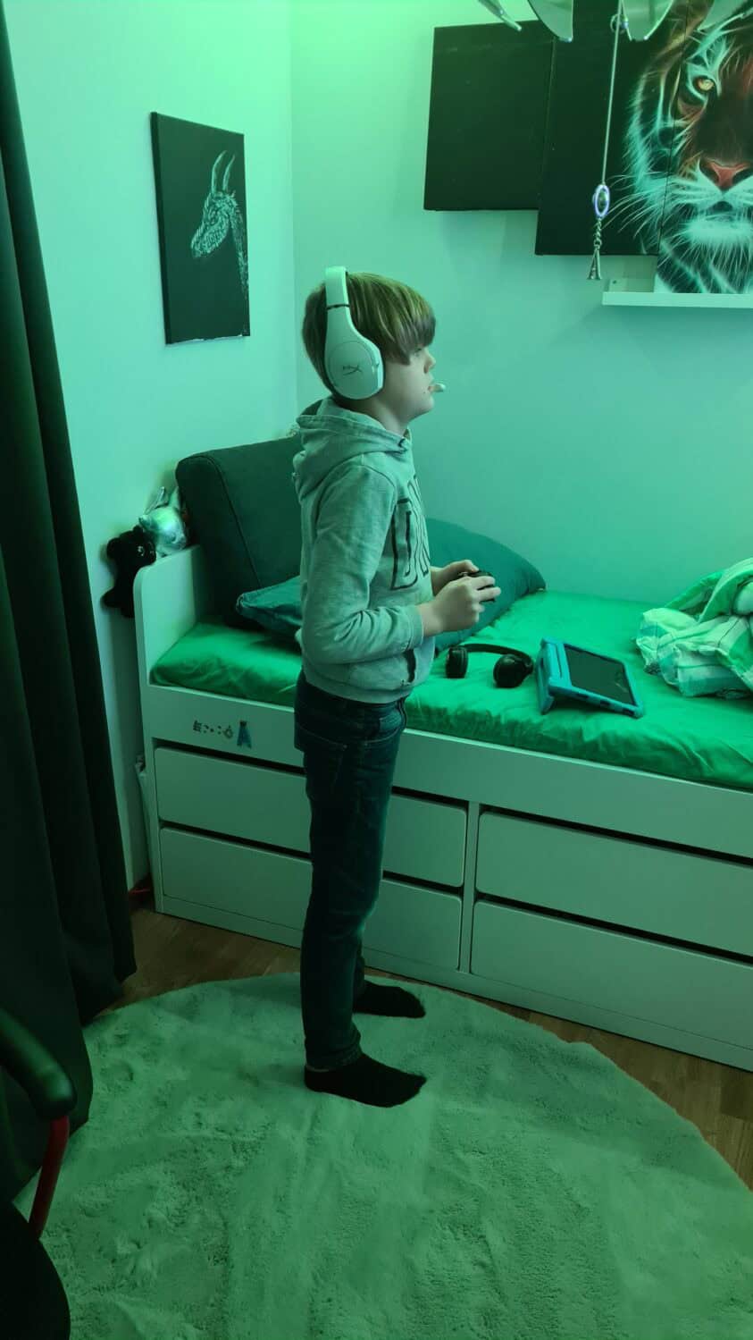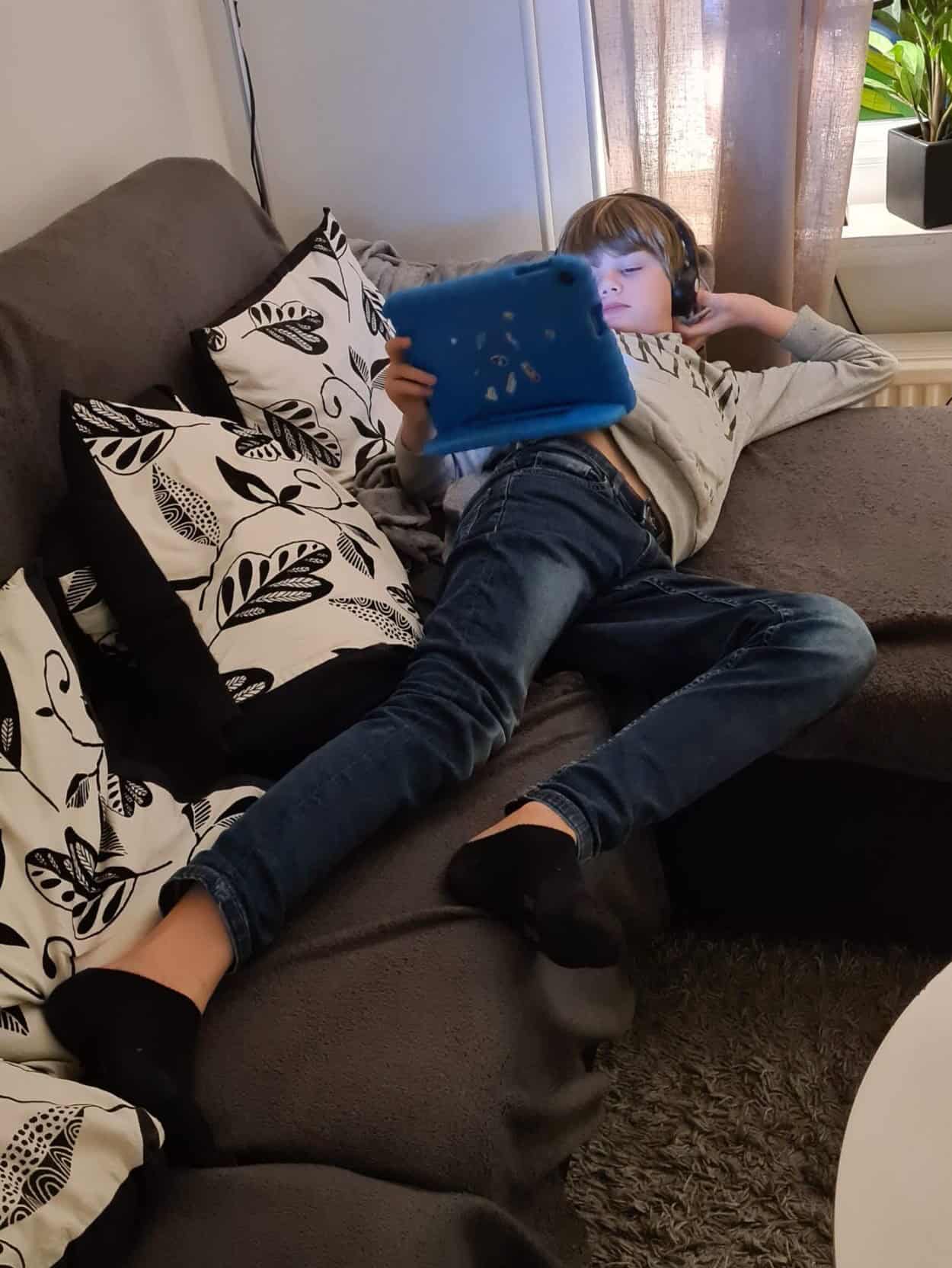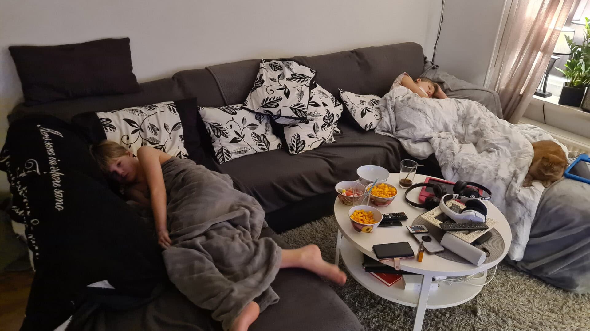 Nu har han kommit ut från sitt rum och la sig i soffan så det är ju ingen större skillnad.